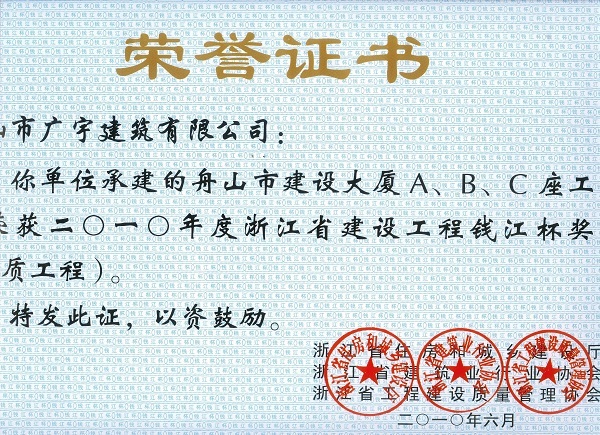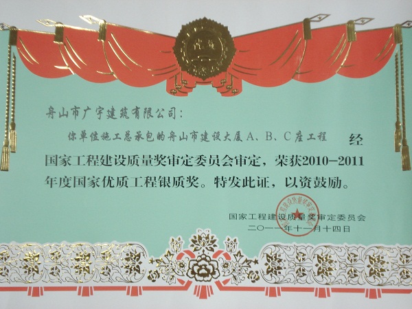 2010-2011年度國(guó)家優(yōu)質(zhì)工程獎(jiǎng)銀質(zhì)獎(jiǎng)(舟山建設(shè)大廈C座)